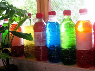 The art teacher at the school Regina said to me, "We don't throw away anything, we reuse everything, and make art out of it." A group of teachers and I were visiting classrooms and we noticed plastic bottles lined up on windowsills and bookshelves, all filled with different colored water. We asked the art teacher what they were for and she responded, "That's an example of how we reuse everything. As the year progresses students based on their contribution to the community, earn first the bottle cap, then the bottle, then finally they fill the bottle up with water of their favorite color. Finally, the students choose a tree in the area in the courtyard to hang their bottle on." She pointed out the window.