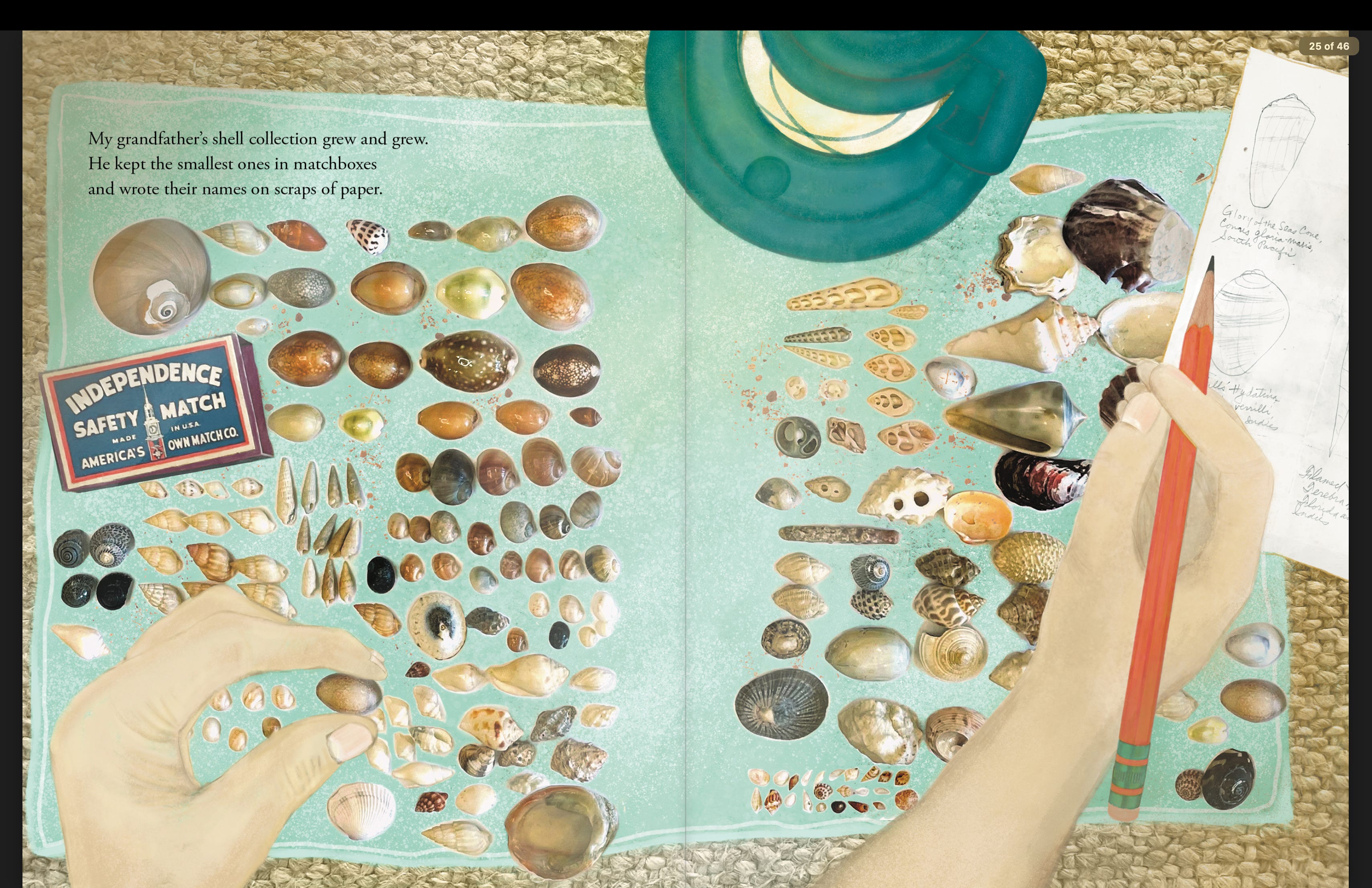 One full spread in the book shows the complete shell collection—an image of careful attention, inheritance, and remembrance.